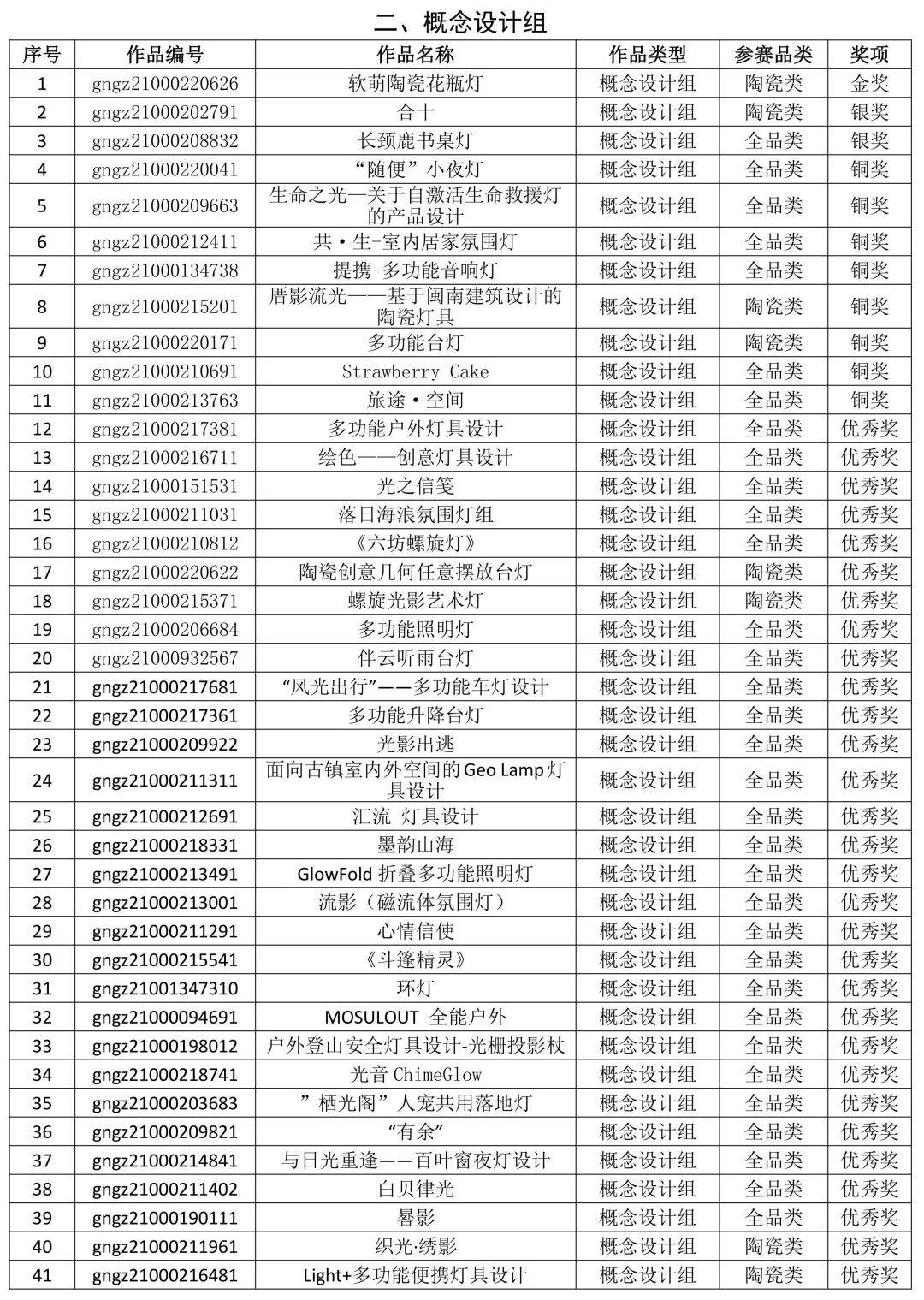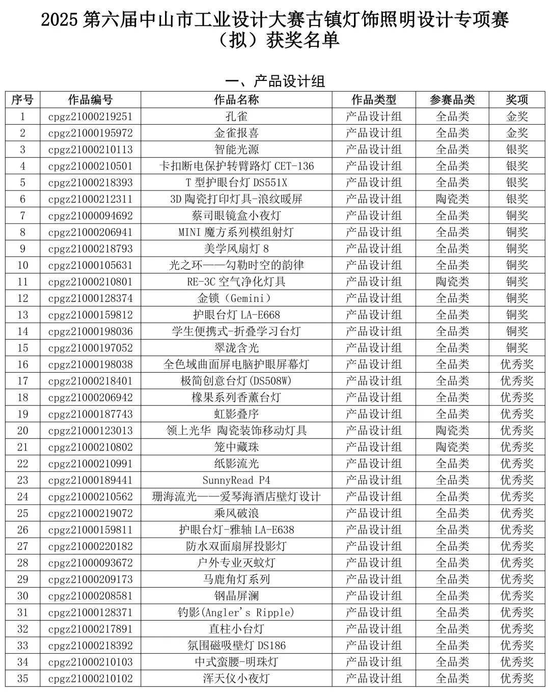 终评专家组本着厉谨、公允的准则,对参赛作品的改进性、适用性、工艺可行性、市集价格等方面实行了归纳评分,最终评选出本届灯饰照明计划专项赛产物计划组金奖2名、银奖4名、铜奖9名、精良奖20名,以及观点计划组金奖1名、银奖2名、铜奖8名、精良奖30名。名单如下: